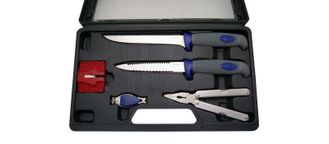 В комплект входит два ножа, мультиинструмент, (плоскогубцы с доп.функциями).